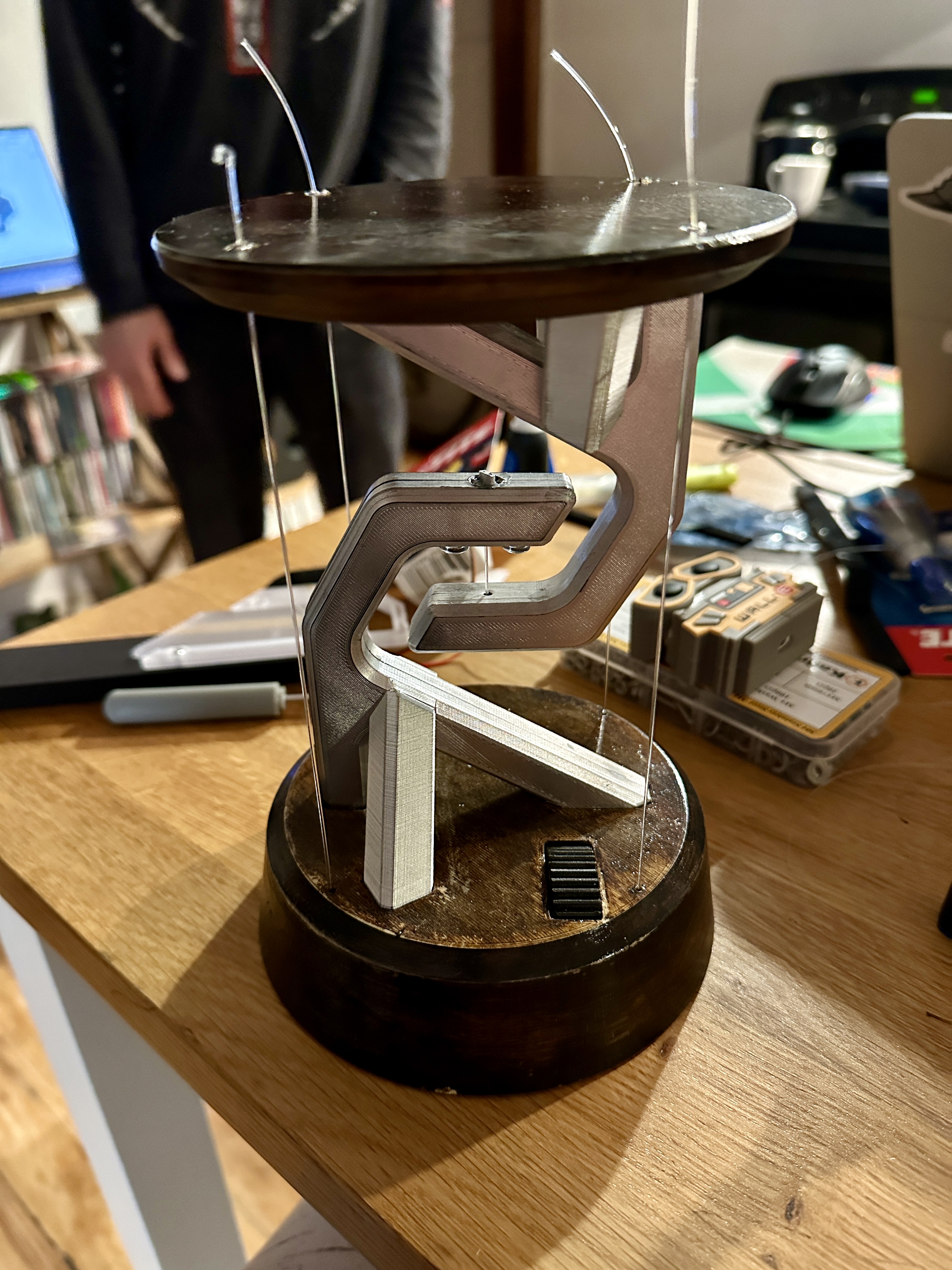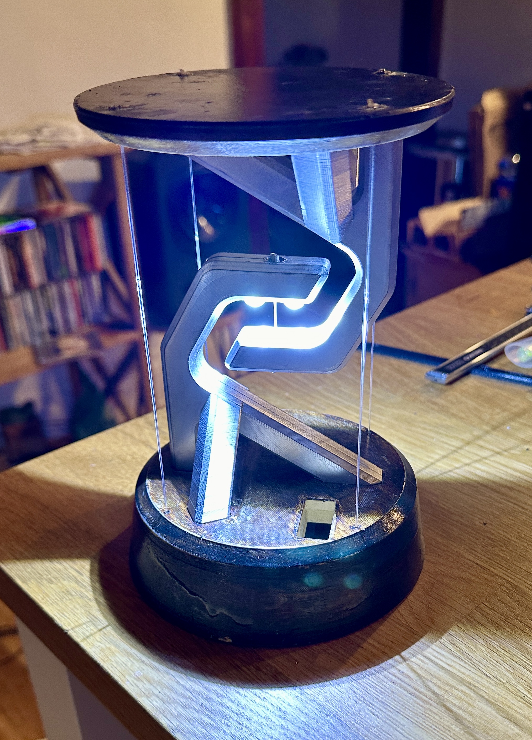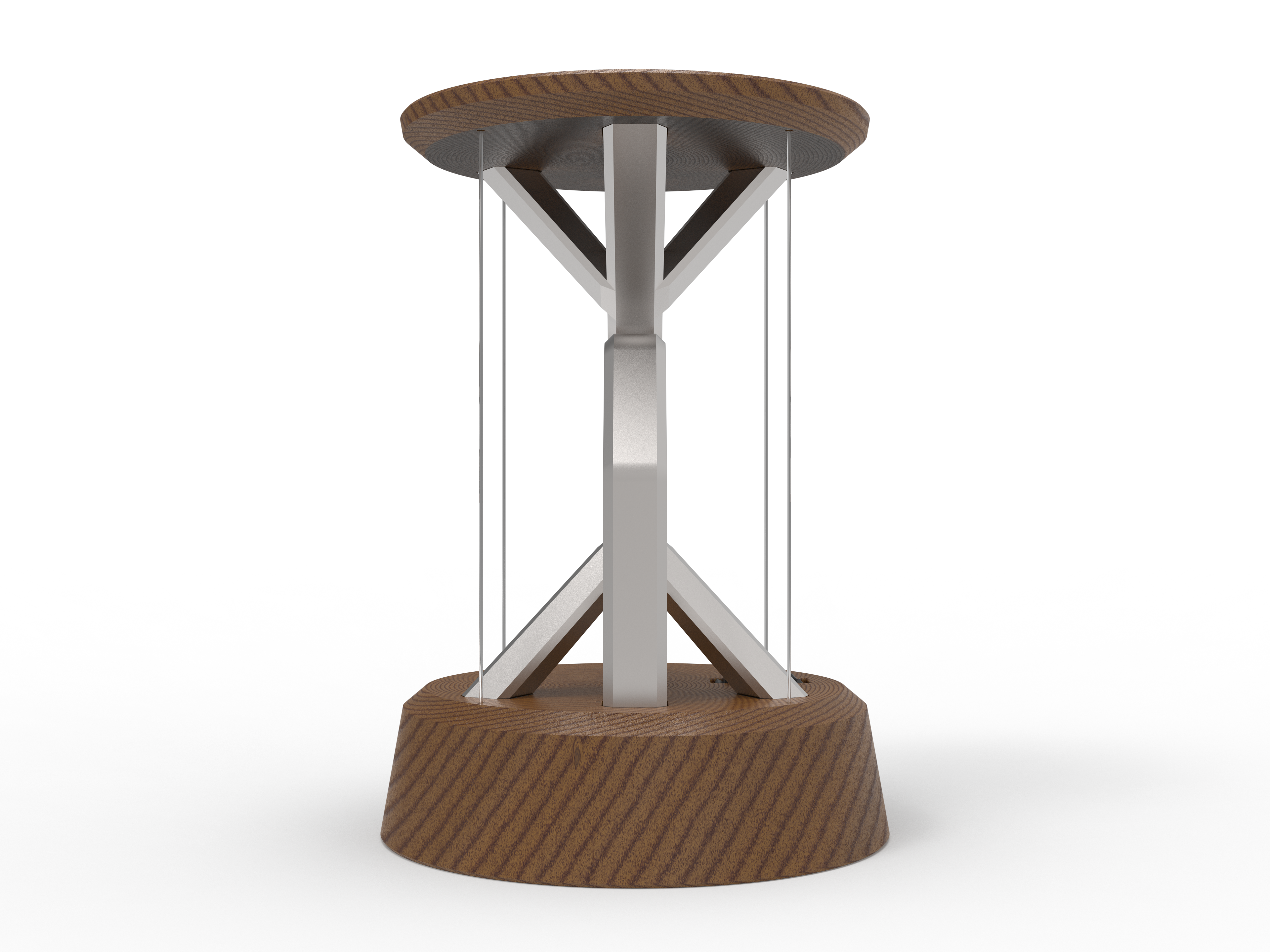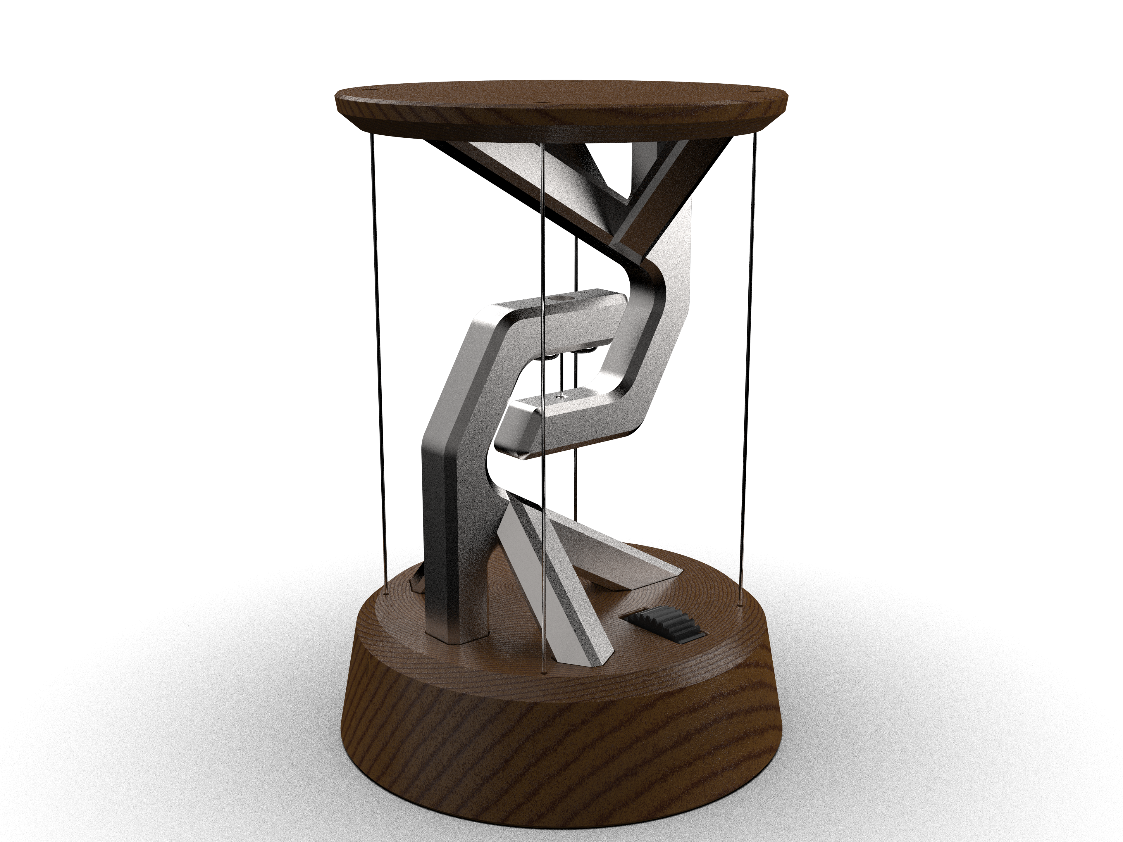 A battery powered desk lamp utilizing tensegrity to make it appear as if it's floating.