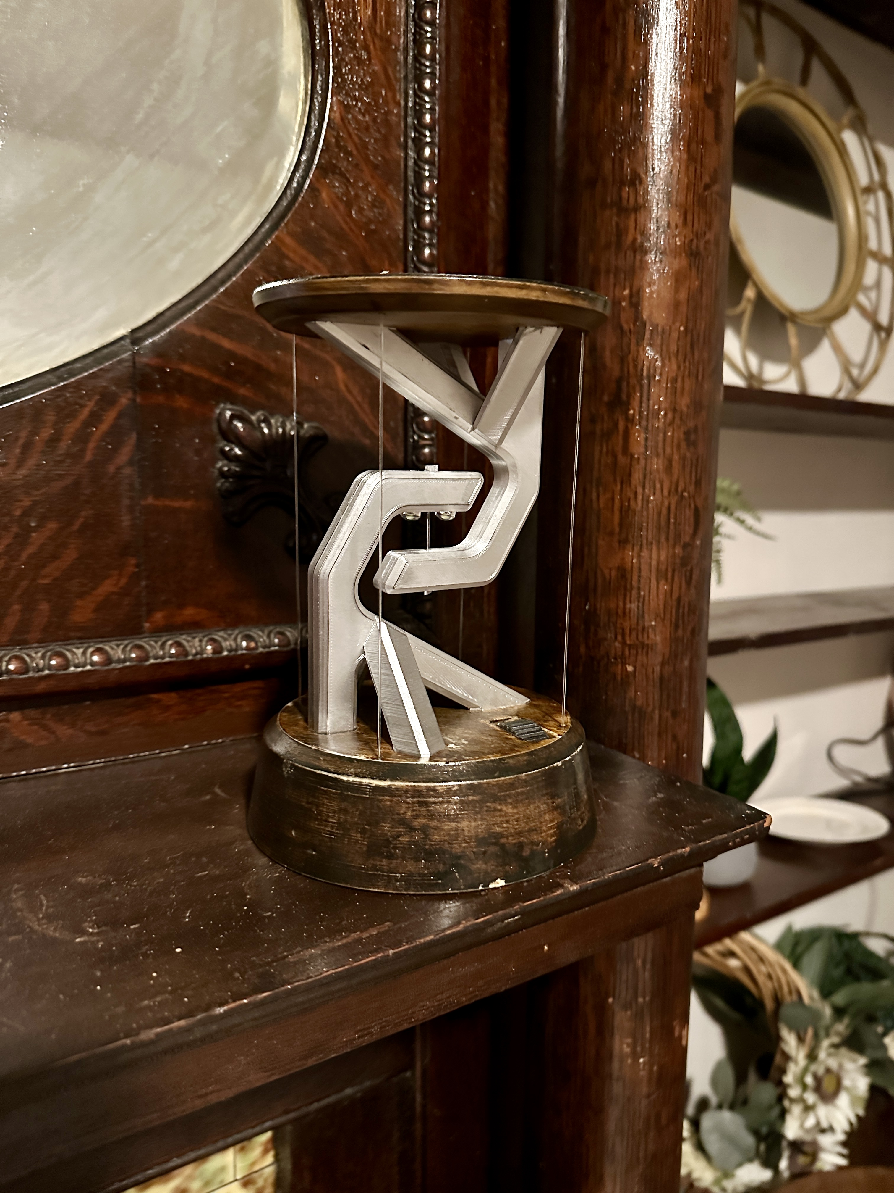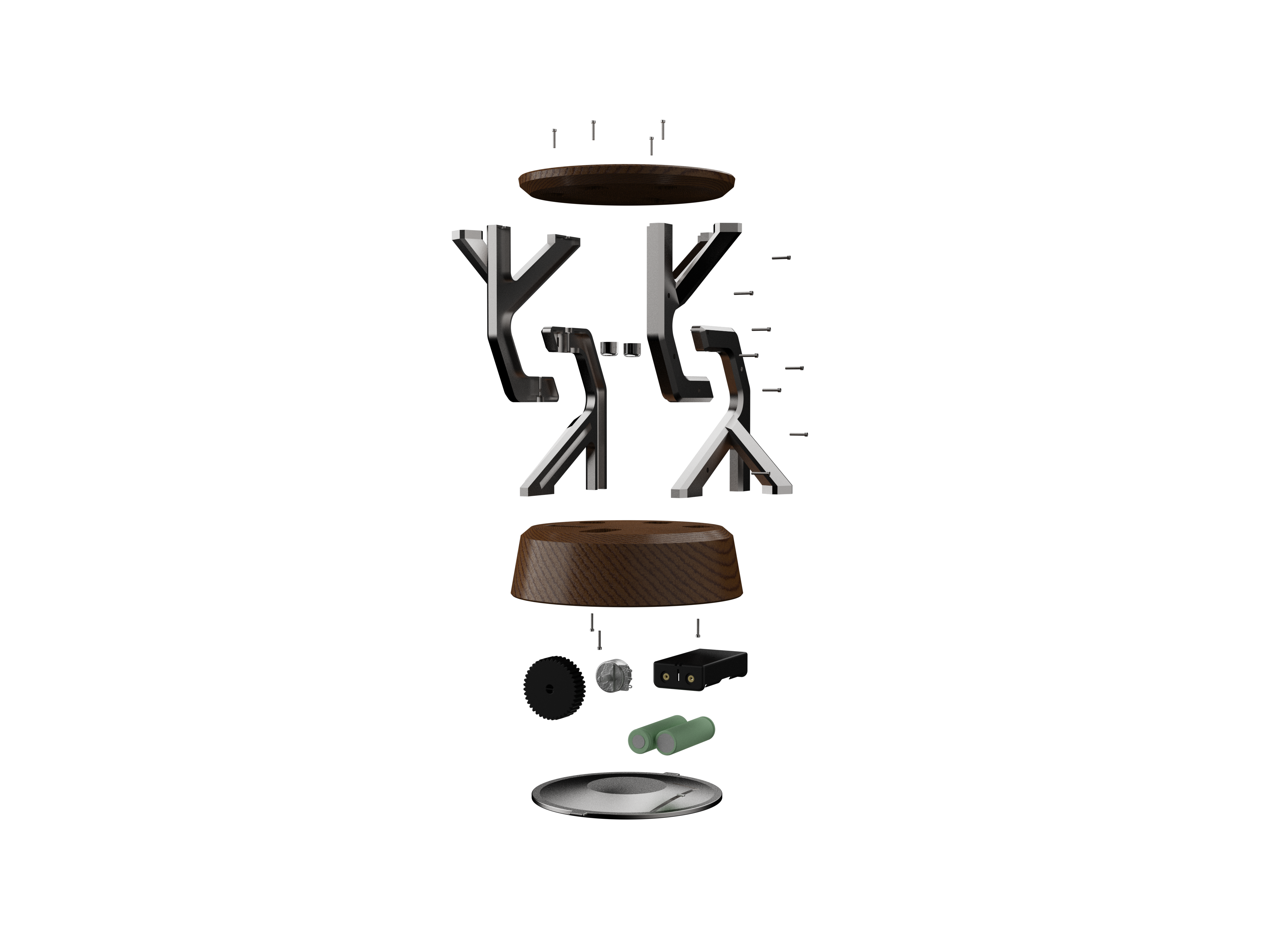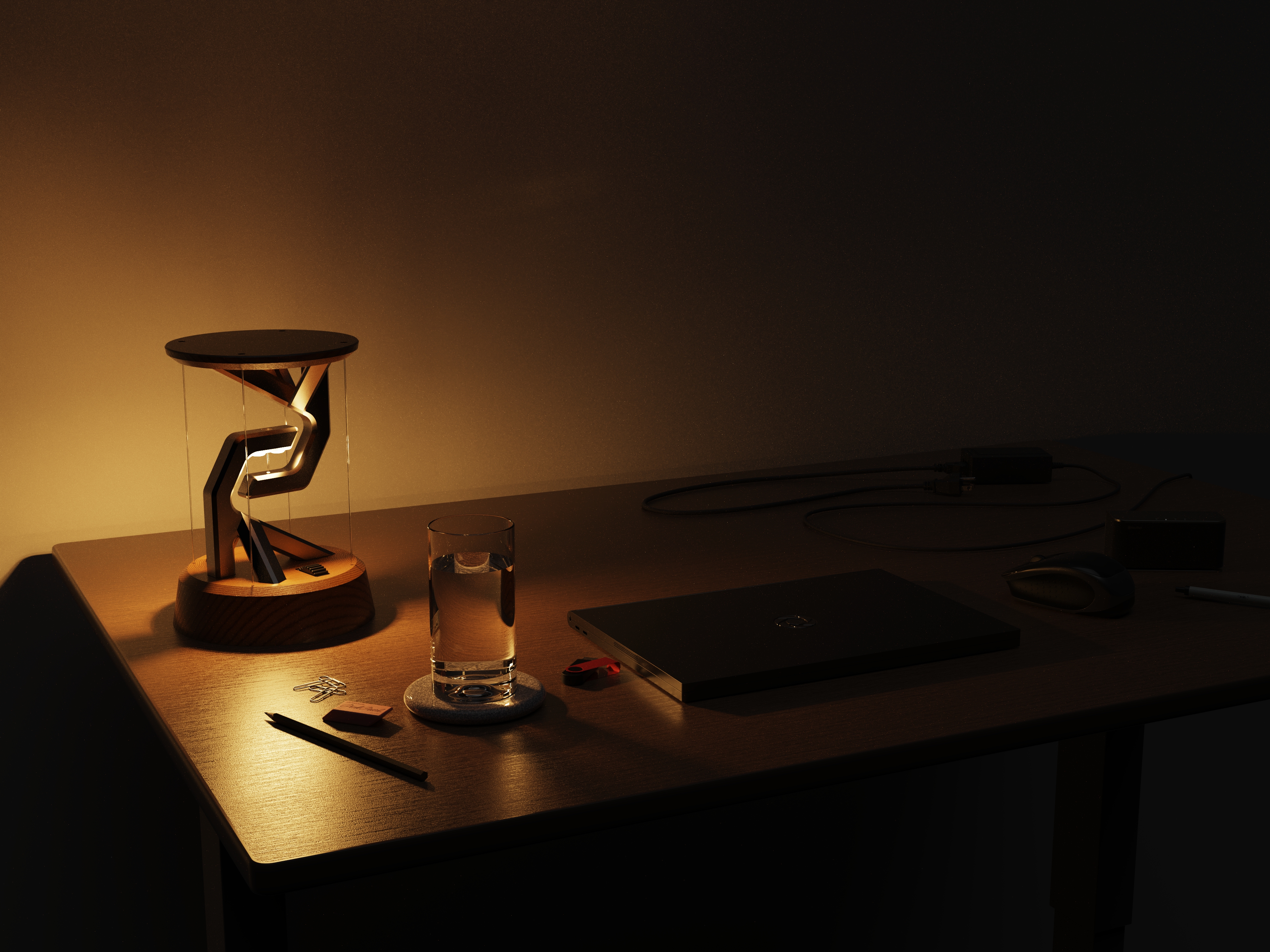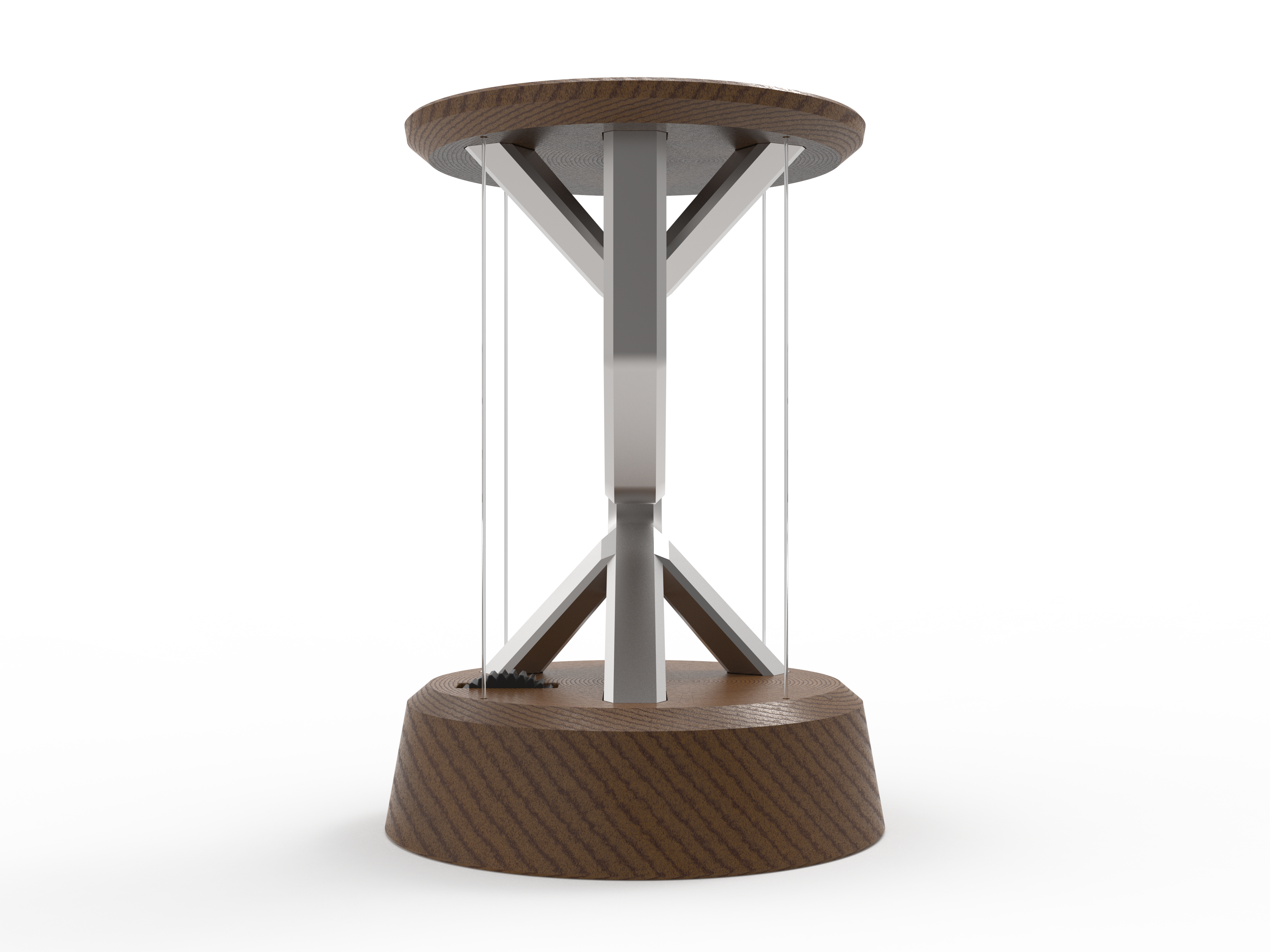 A battery powered desk lamp utilizing tensegrity to make it appear as if it's floating.