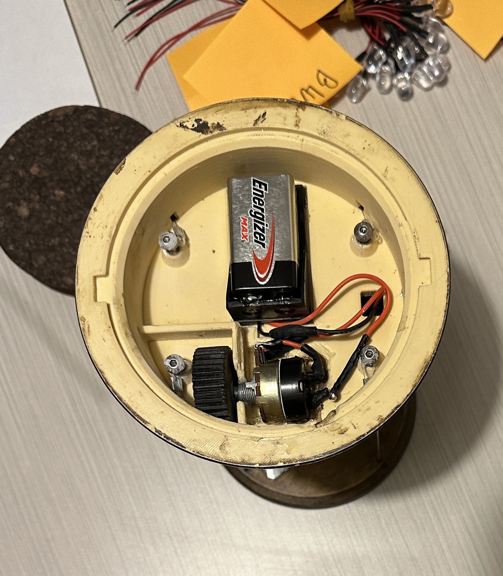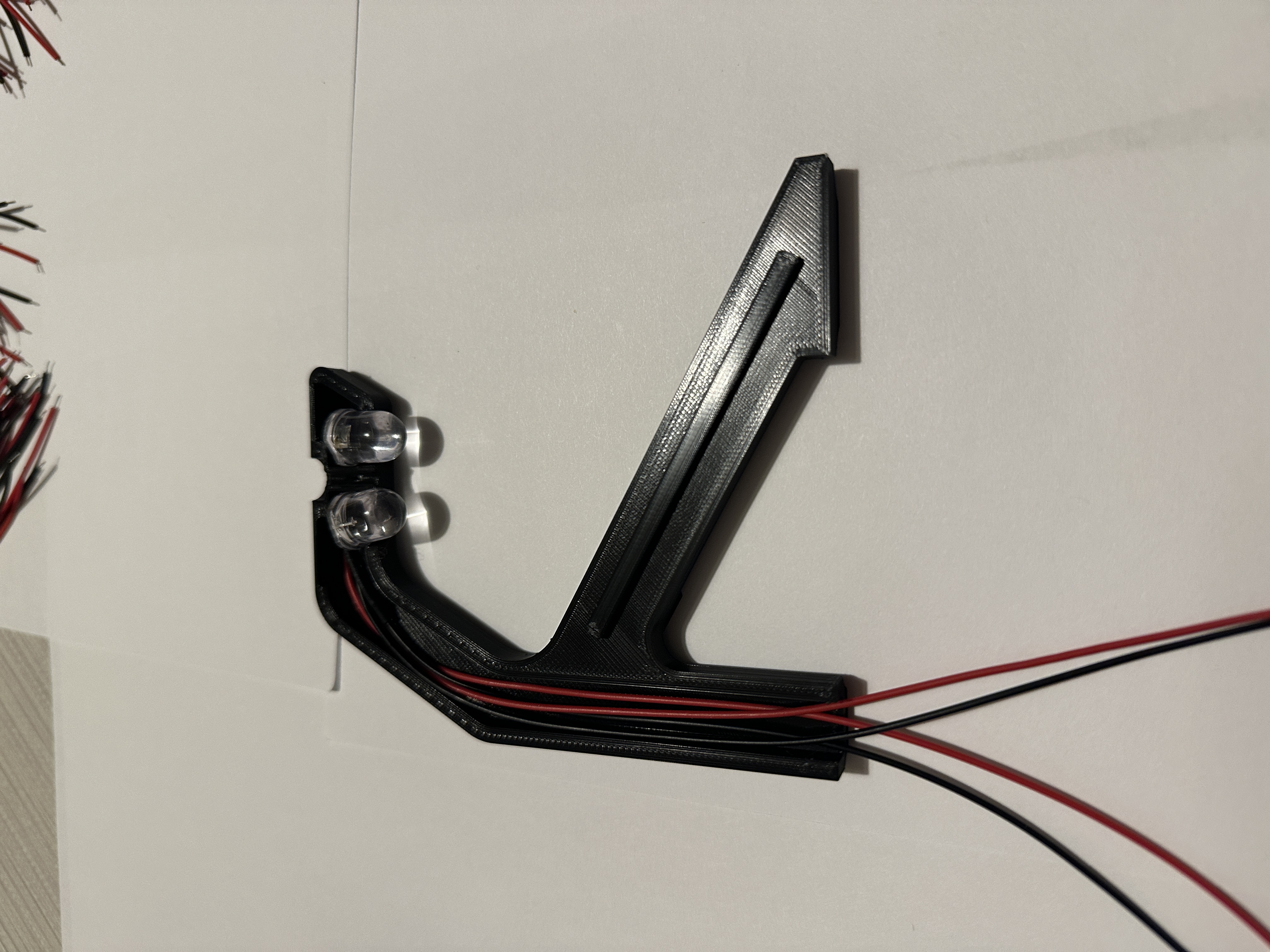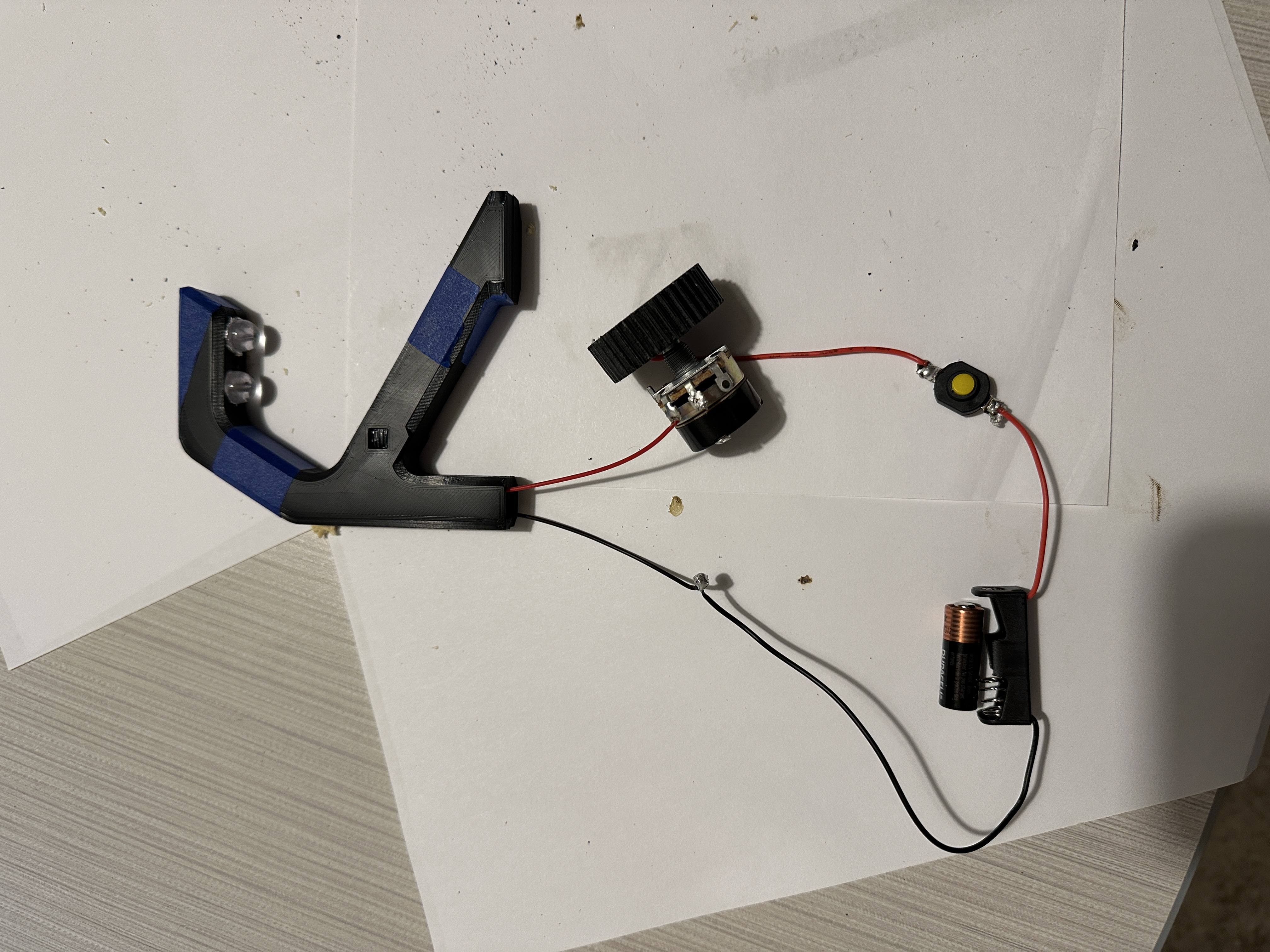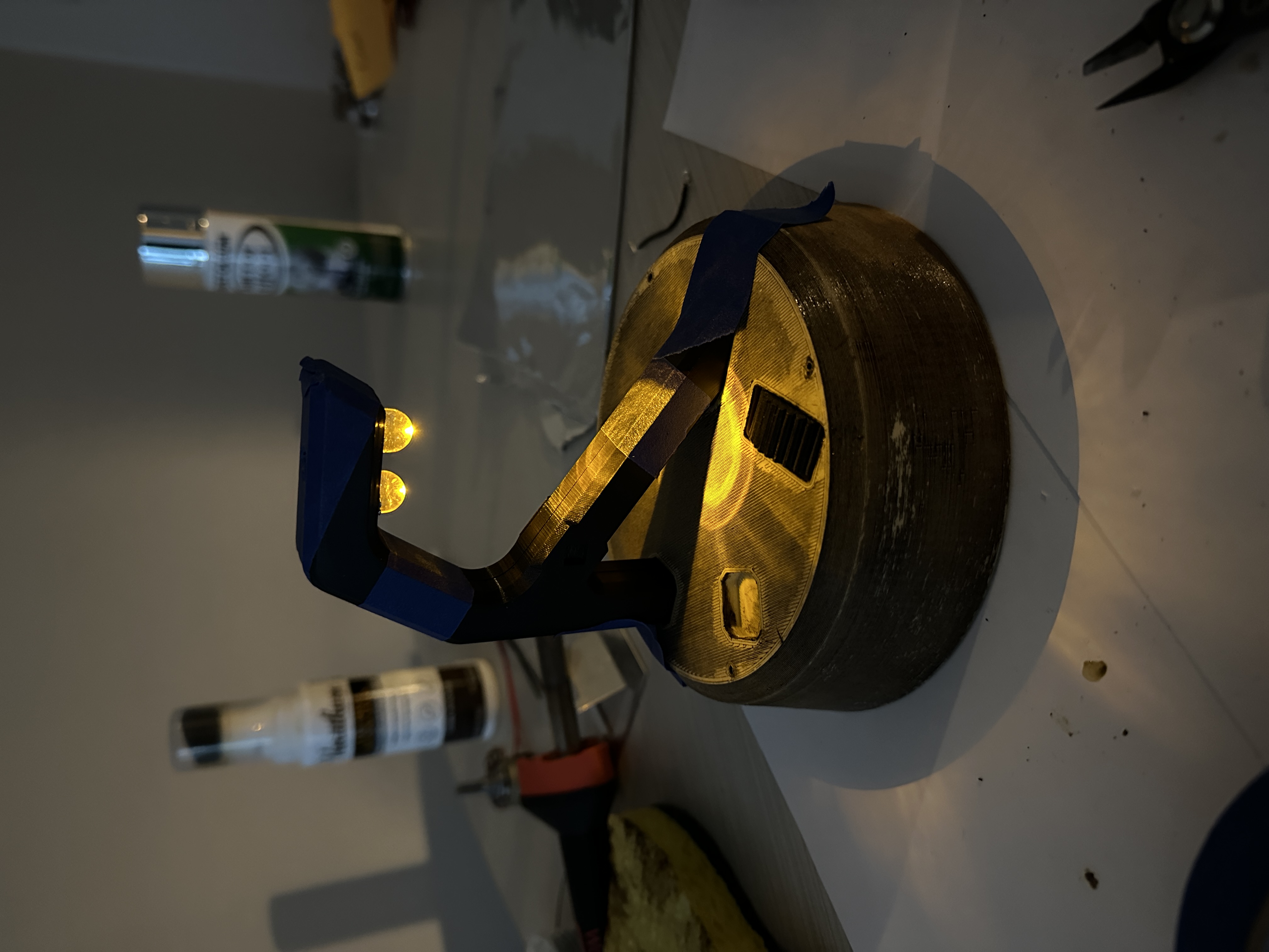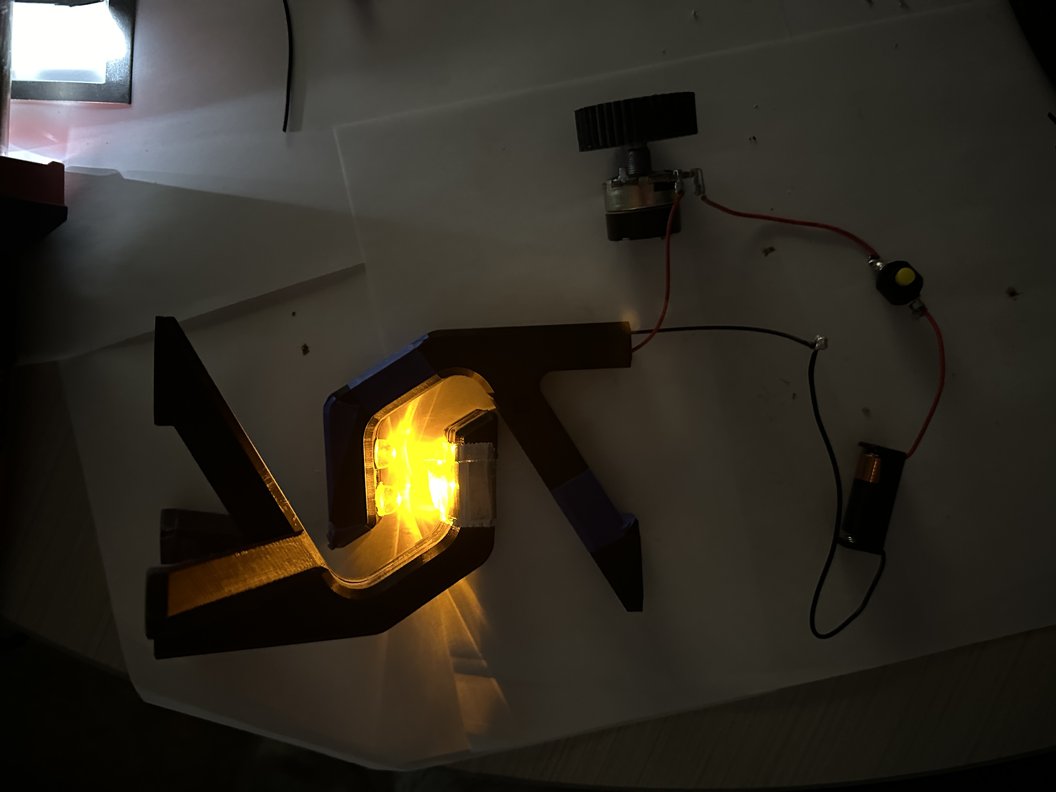 Once modeled all the parts were 3D Printed they were painted and assembled. lights, switches, and the battery pack was soldered together. Lastly the string was added and tightened.